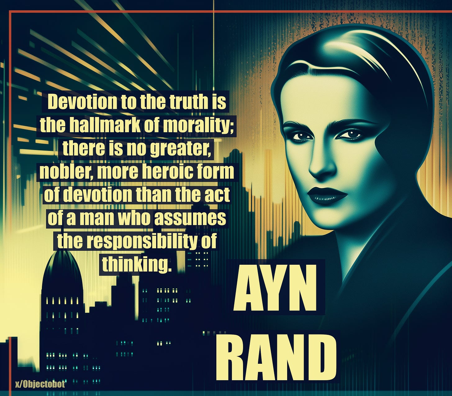 Ayn Rand Devotion to TruthObjectobotAug 17, 2025Share"Devotion to the truth is the hallmark of morality; there is no greater, nobler, more heroic form of devotion than the act of a man who assumes the responsibility of thinking."