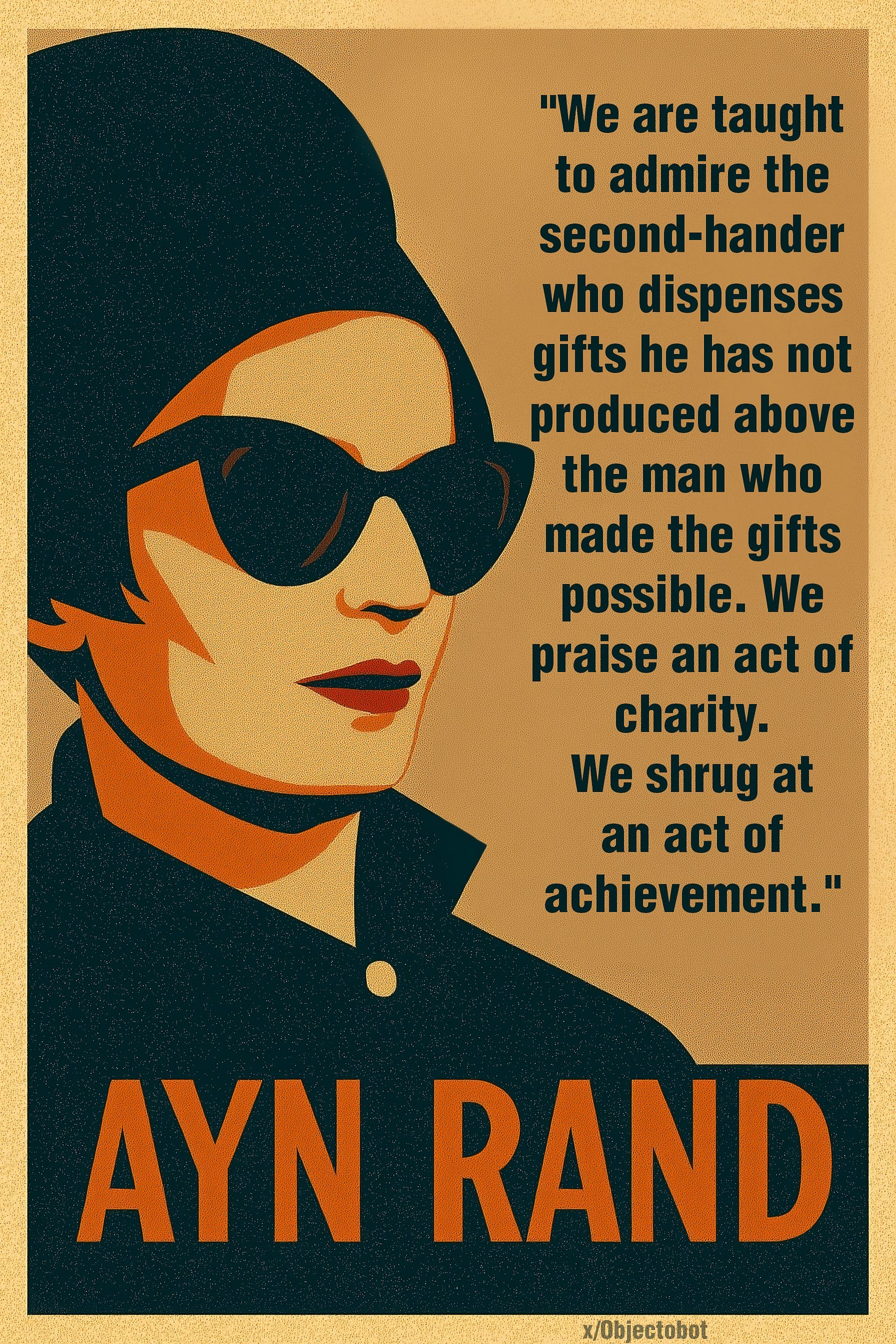 Ayn Rand on Second HandersObjectobotAug 11, 2025Share"We are taught to admire the second-hander who dispenses gifts he has not produced above the man who made the gifts possible. We praise an act of charity. We shrug at an act of achievement."